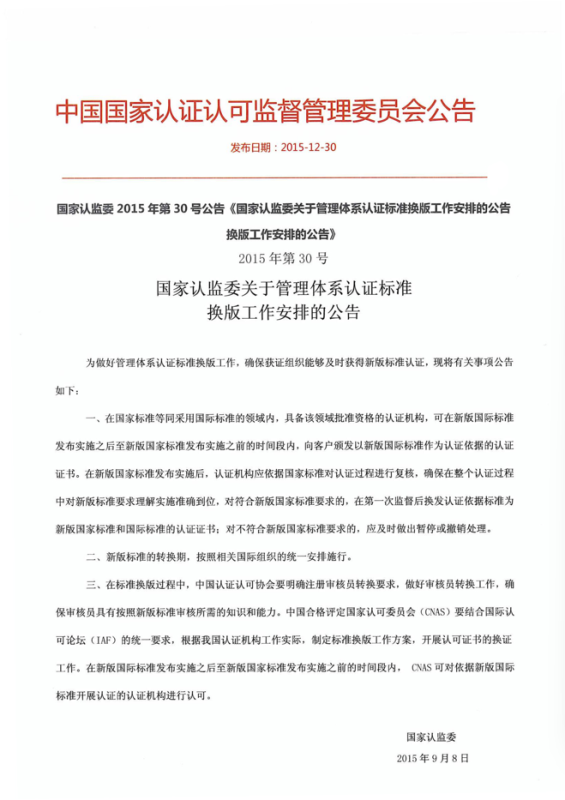 國家認(rèn)監(jiān)委2015年第30號(hào)公告《國家認(rèn)監(jiān)委關(guān)于管理體系認(rèn)證標(biāo)準(zhǔn)換版工作安排的公告換版工作安排的公告》
